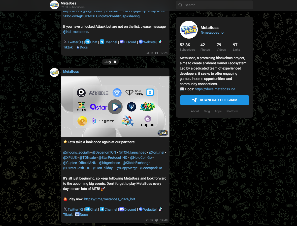 Metaboss раньше активно продвигал свою игру через мессенджер Телеграм под названием Metaboss Io, на который подписаны около 52 000 человек. Тут публикуются разные новости в мире криптовалюты, об игре Meta Boss bot и разные партнерские отношения.