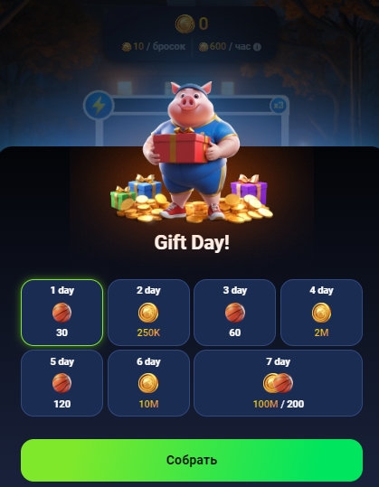 Piggy bank тапалка в Телеграмм – как играть и майнить эффективнее? За ежедневное посещение piggybank тг дают призы – получает их пользователь не автоматически, а нажав Собирать в разделе Задания. Первые 6 дней посещения будут начислены либо баскетбольные мячи, либо внутриигровые монеты, на 7-ой день приз составит 100 млн. монет и 200 мячей.