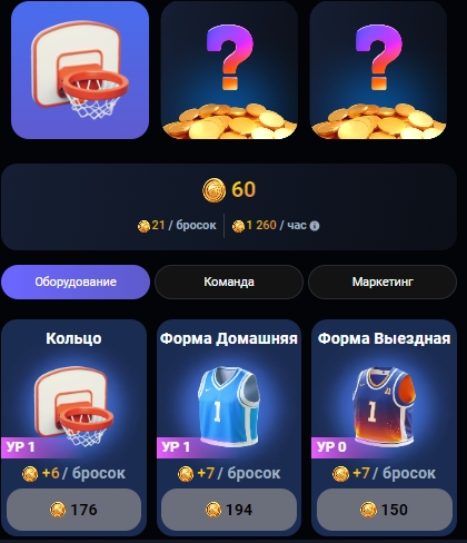 В разделе Улучшения можно покупать карточки, которые дают больше монет за каждый бросок и увеличивают награды в пассивным фарминге.