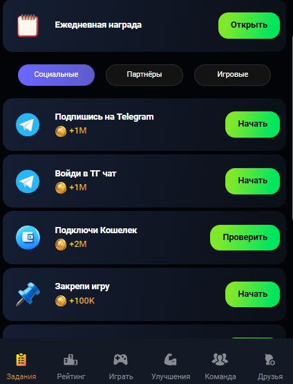 Рассмотрим меню игры в футере экрана. Здесь представлены следующие разделы: Задания, Рейтинг, Играть, Улучшения, Команда, Друзья. Награды за задания начисляются в монетах. Например, за подписку на канал баланс пользователя увеличится на 1 млн. монет, а за подключения кошелька – на 2 млн.