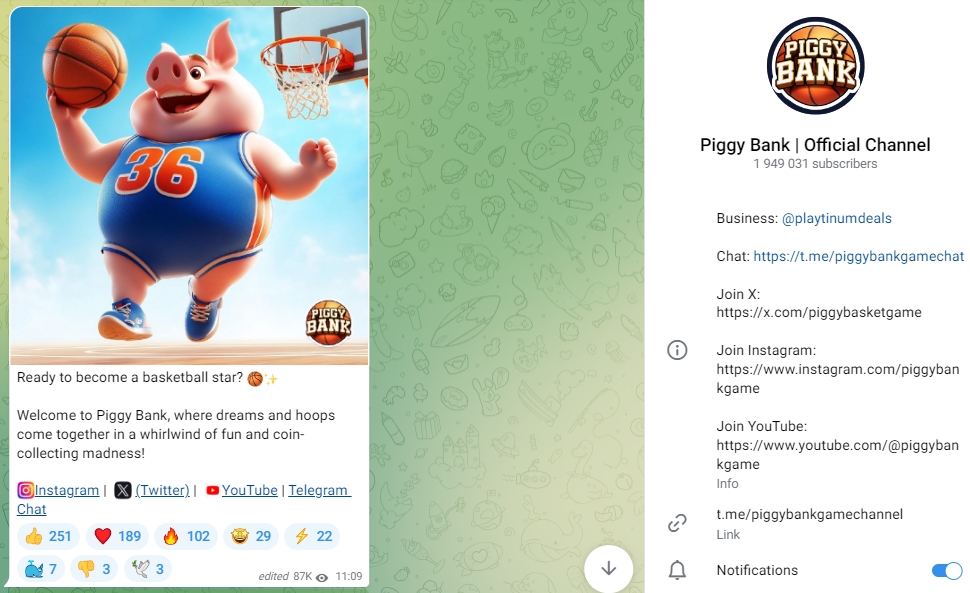 На канале в Телеграмме Piggy Bank Official Channel более 1,9 млн. подписок, при этом просмотры постов составляют примерно 150 тыс. – это высокий показатель, но всё же общая аудитория на канале накручена. Также у проекта есть Instagram, YouTube, Twitter и Чаты в Telegram (в том числе русскоязычный). Среди постов – тесты с проверкой знаний на факты о баскетболе, конкурсы от кликера и новости игры. Англоязычный чат по содержанию бесед ближе держится к тематике кликера – здесь пользователи делятся своими результатами и ищут игроков в команду, в то время как Piggy Bank RU Official Chat превратился в болталку “обо всём”.