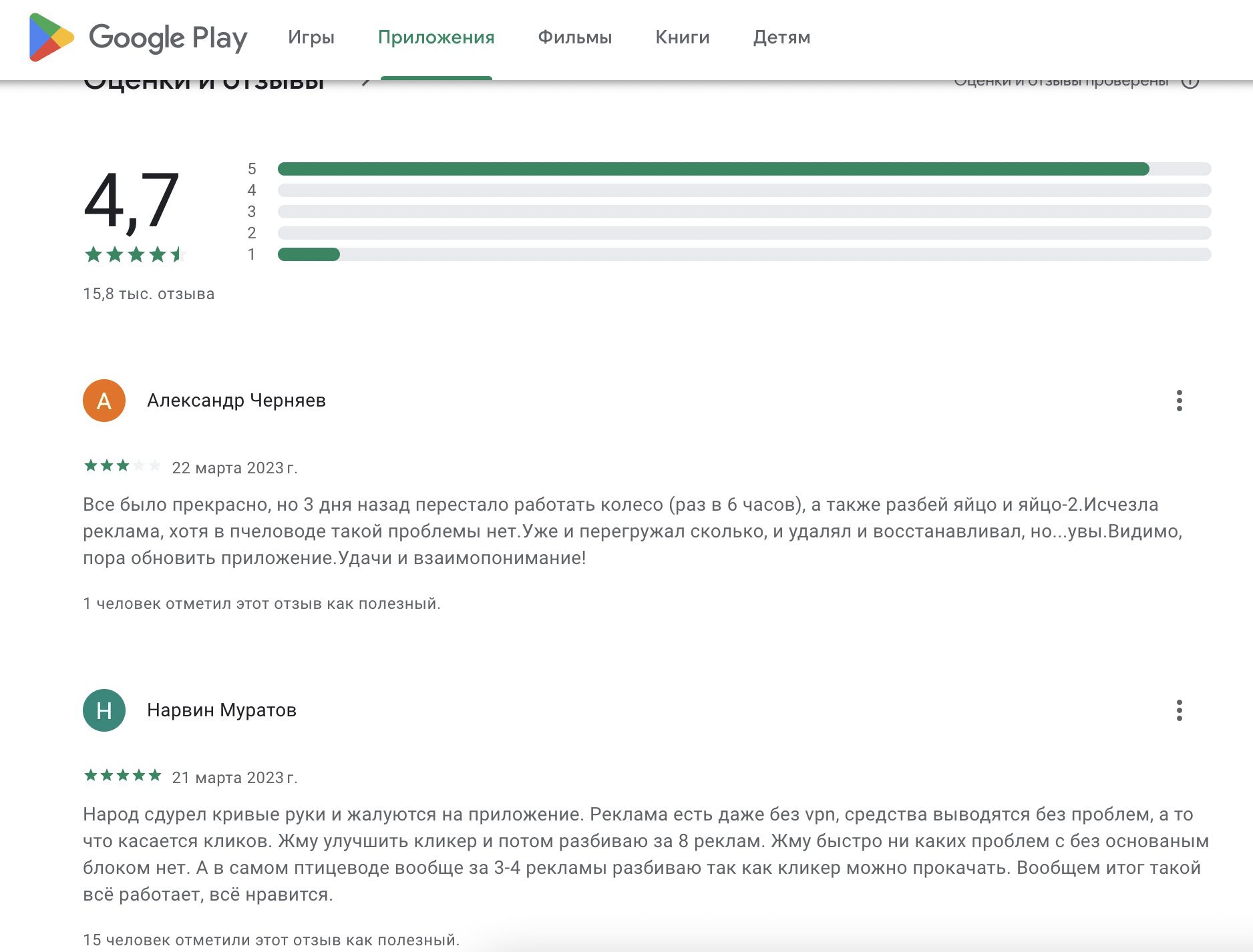 Игра с выводом Птицевод имеет высокий рейтинг на Google Play (4.7) и более 500 тысяч скачиваний, что указывает на отсутствие явного мошенничества.