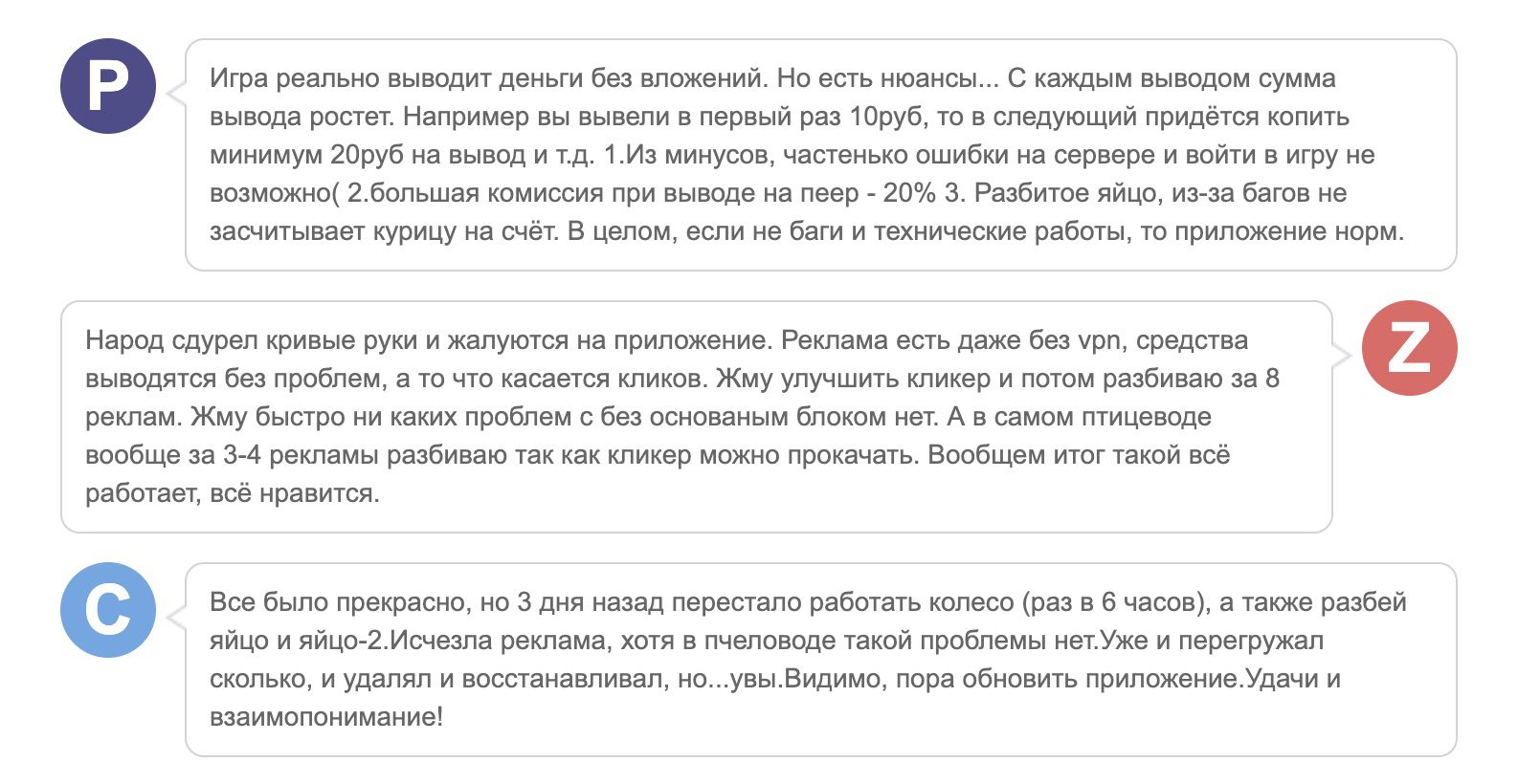 Отзывы реальных людей о заработке денег в Птицеводе в основном положительные. Однако периодически всплывают комментарии, указывающие на блокировку крупных счетов и остановку выплат. Также пользователи жалуются на блокировки за автоматизацию игрового процесса.