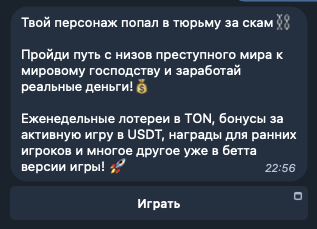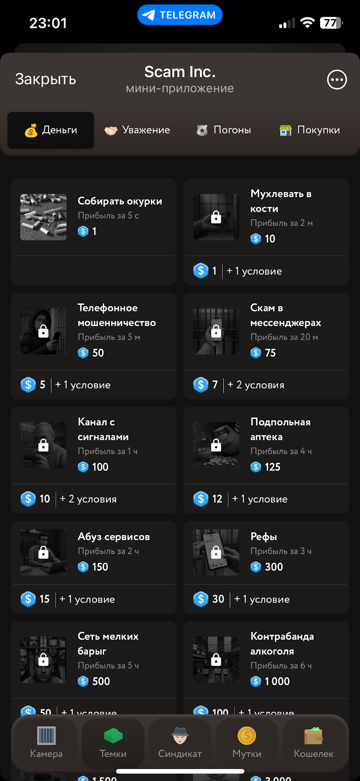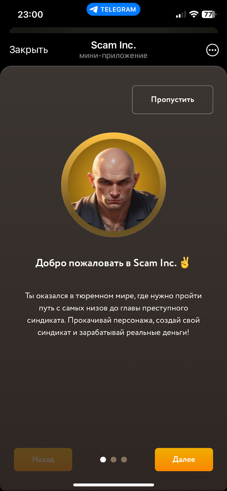 Scam Inc – игра-тапалка, которую нужно запускать через телеграм-бота. Игроку предлагают наращивать репутацию арестанта. Для этого вначале нужно тапать и выполнять задания от разработчиков, а затем инвестировать в покупку улучшений.