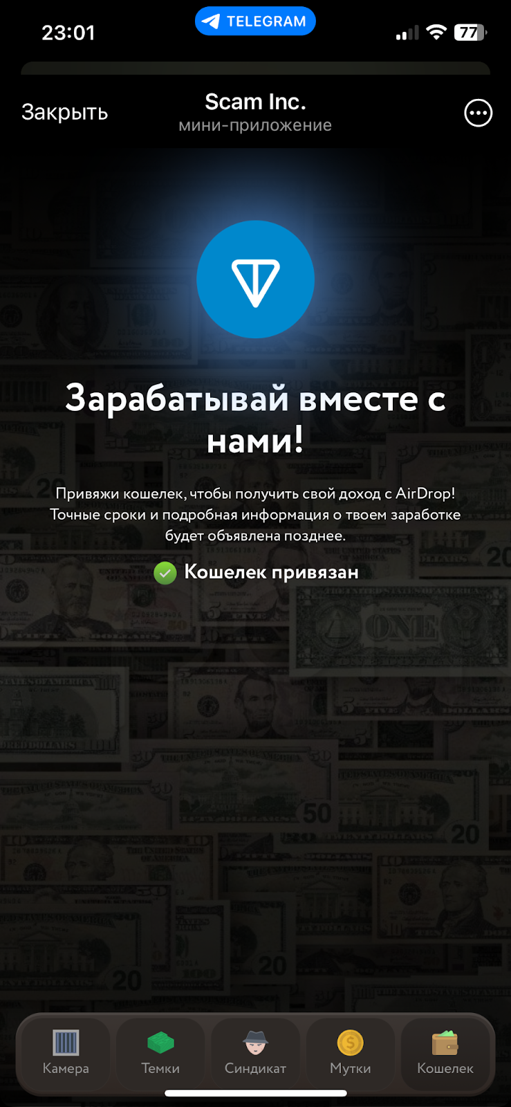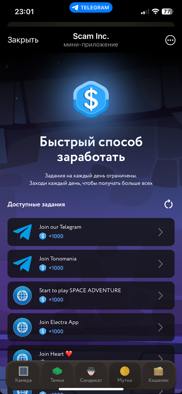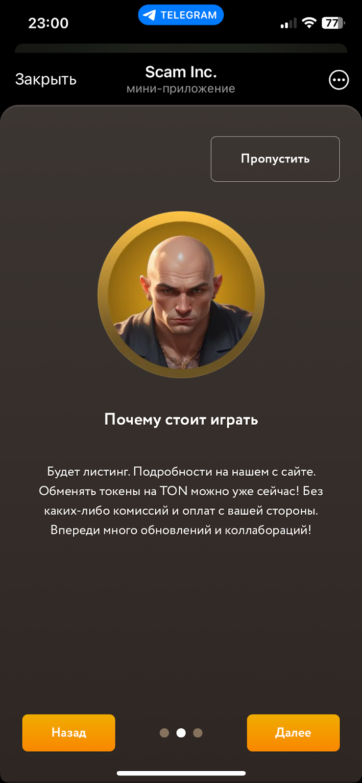 Телеграмм-тапалка Scam Inc появилась на фоне возросшего интереса к крипто-кликерам, которые работают на базе популярного мессенджера. Эта игра по набору возможностей полностью повторяет популярное приложение «Хомяк».