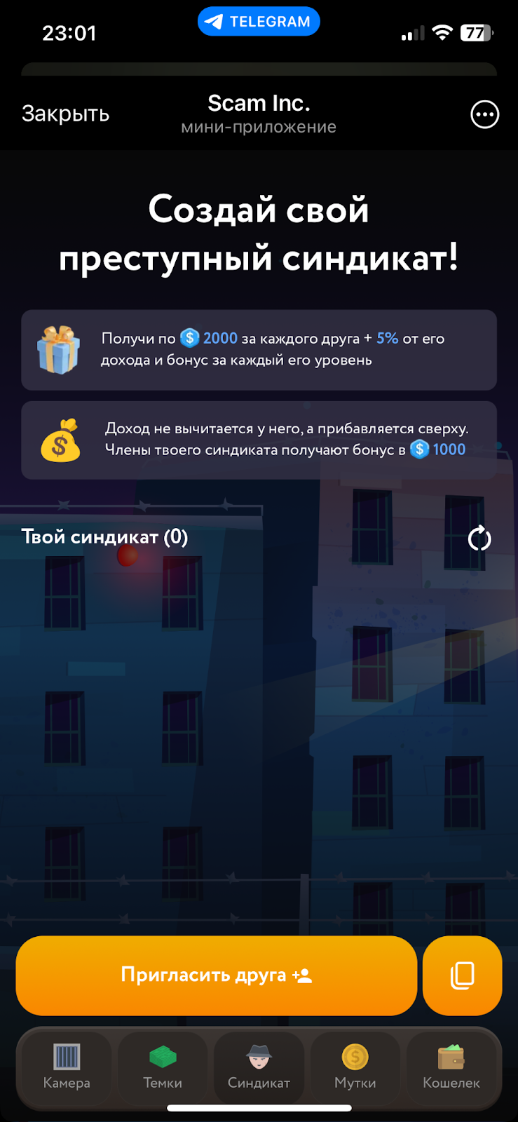 В игре есть реферальная программа. За каждого привлеченного в проект нового пользователя выплачивают 2000 монеток. Рефералу, который зарегистрировался по ссылке, дают 1000 очков. Затем система выплачивает 5% от всего заработка, который был получен другом в игре. Инструменты для приглашения находятся в разделе «Синдикат» мини-приложения.