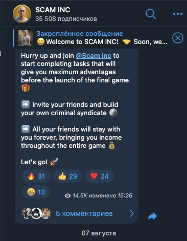 На телеграмм-канал Scam Inc, на 31 октября 2024-го года, подписано около 35,5 тысяч пользователей. Публикации просматривают в среднем 15 тысяч раз.
