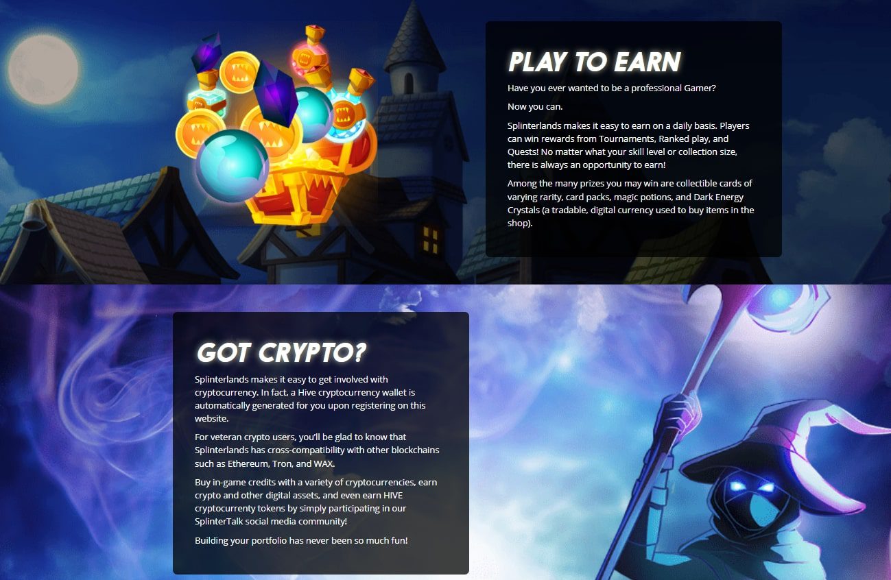 Платформа разработана в 2018 году: для получения прибыли клиентам предлагается пользоваться специализированными картами, представляющие собой внутреннюю валюту игры Splinterlands – криптовалюта, токены. Картами можно торговать на внутренней бирже, выводить номинал на кошелек, а также продавать другим пользователям.