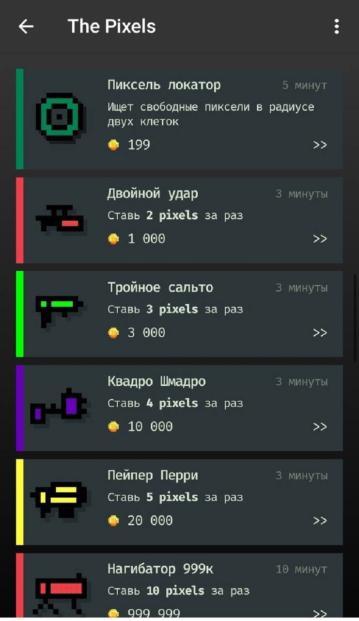 - “нагибатор 999к” — ставит 10 пикселей за раз, цена 999 999 монеток.