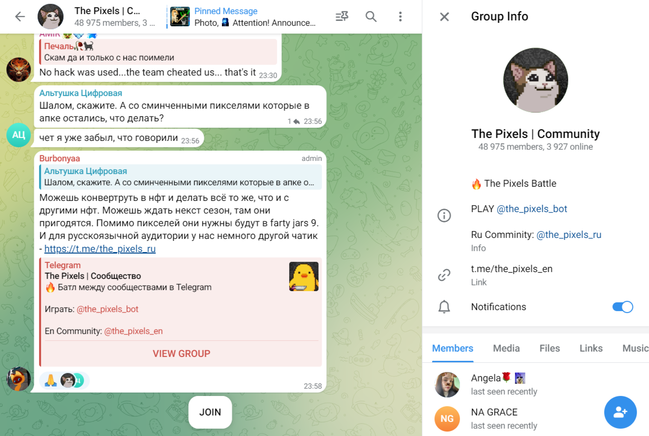 - Чат в Телеграм “The pixels en”, в котором участвуют около 50 000 человек.