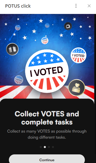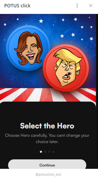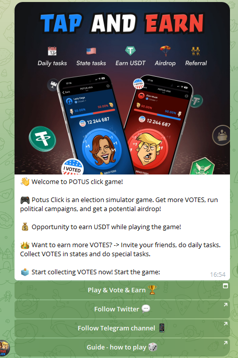 Potus Click – это бот в Телеграме, который позволяет пользователям зарабатывать «голоса», поддерживая одного из двух виртуальных кандидатов.