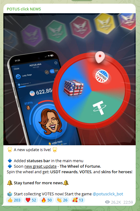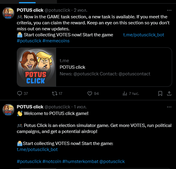 Информация об игре-тапалке Potus Click есть в Телеграме, также есть лента в Х, где публикуются последние новости и поздравления для тех команд, чьи кандидаты лидируют в еженедельных или месячных рейтингах.Последние новости
