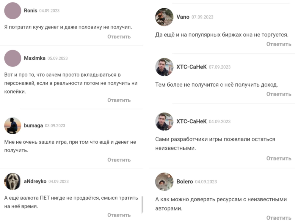 В Интернете есть негативные отзывы о tongochi: пользователи отмечают необходимость вложений, низкую прибыль и невозможность продажи токенов на биржах. В социальных сетях игры подозрения в накрутке подписчиков и недостатке открытости команды разработчиков. Мы не рекомендуем игру, так как заработок с tongochi game невозможен.