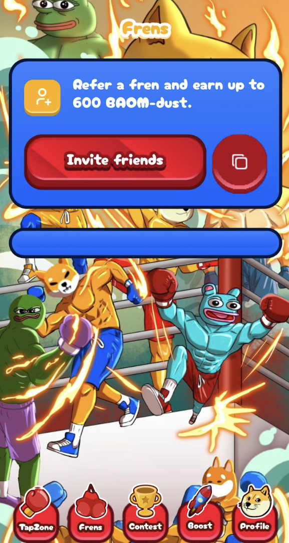 За приглашение каждого друга в игру Baom система выплачивает моментальное вознаграждение в размере 600 BAOM-dust. Соответствующая реферальная ссылка находится в разделе Frens.