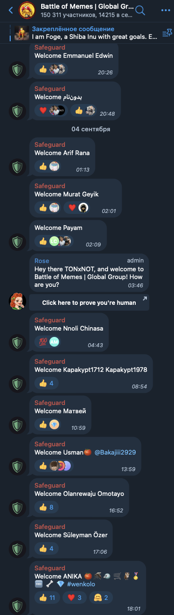 Однако соответствующие посты ни при каких условиях нельзя считать за отзывы о «Батле оф Мемс». В чат, как правило, пишет бот, который просто приветствует присоединившихся к сообществу участников.