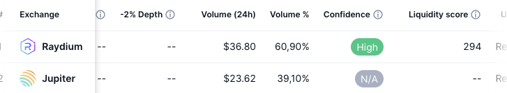 Токен BAOM уже торгуется на паре криптовалютных бирж. В частности, его можно встретить на Raydium и Jupiter. Правда, оборот крипты BAOM Token на соответствующих площадках ничтожен. В сумме набирается лишь чуть больше 50-и долларов.