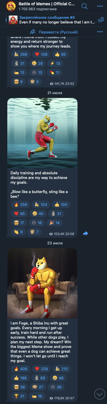 Официальное сообщество BattleOfMemes – это телеграм-чат Battle of Memes Global Group. В нем, в свою очередь, насчитывается около 150 тысяч участников. Настоящая активность в чате является ничтожной. Большинство сообщений в ленту пишет бот.