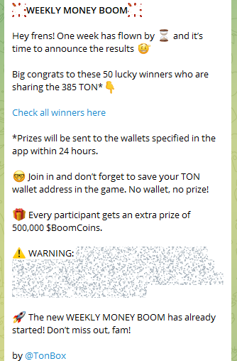 10 сентября 2024 года прошло очередное событие WEEKLY MONEY BOOM, где 50 победителей разделили между собой 385 TON. Каждому участнику также предоставлен дополнительный приз в виде 500,000 $BoomCoins.