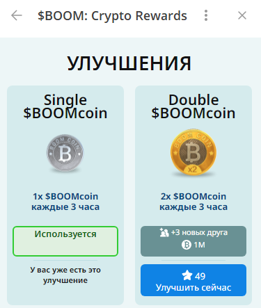 Пользователи могут использовать бустеры. Первый буст выдается каждому пользователю бесплатно. Но остальные можно активировать либо за Звезды Телеграма, либо после того, как игрок привлечет минимум 3 друзей.