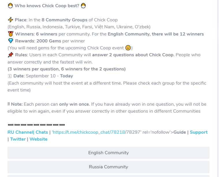 У проекта есть Телеграмм канал ChickCoop announcement, на который подписано около 1,1 млн пользователей. В Chick Coop announcement публикуют условия проведения различных конкурсов. Например, разыгрывают по 2000 гемов среди тех, кто правильно и быстро ответит на вопросы об игре. В чате Chick Coop Chat около 185 тысяч пользователей. Разработчики Chick Coop разделяют аудитории, когда проводят какие-либо ивенты. Но в ChickCoop chat собрано все комьюнити. Новости выходят в Твиттер ChickCoop io, затем дублируются в ТГ канале. На сайте ChickCoop io опубликована информация об игре, White Paper и условия аирдропа. Платформа не русифицирована, все документы представлены только на английском. Белая бумага опубликована на Chick Coop github, что является положительным моментом для проекта.