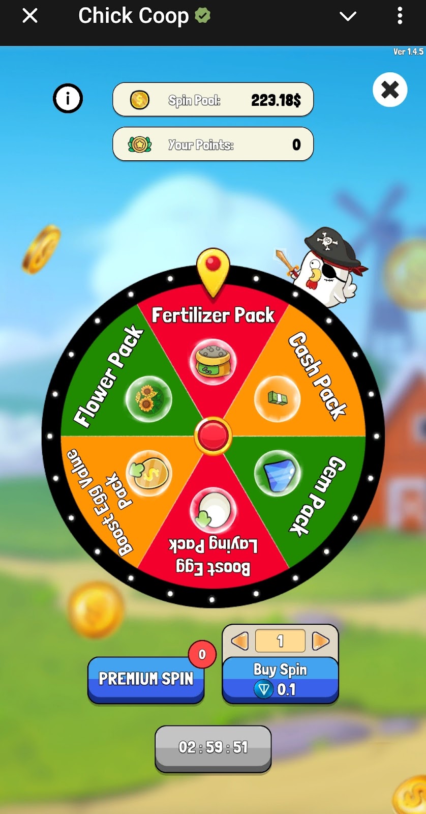 В игре Чик Куп есть колесо фортуны, его можно бесплатно крутить каждые три часа. Для владельцев Телеграмм Премиум дается дополнительная попытка. Купить один спин можно за 0,1 TON. Выиграть можно только игровые ценности, поэтому платить за прокрут колеса точно не стоит.