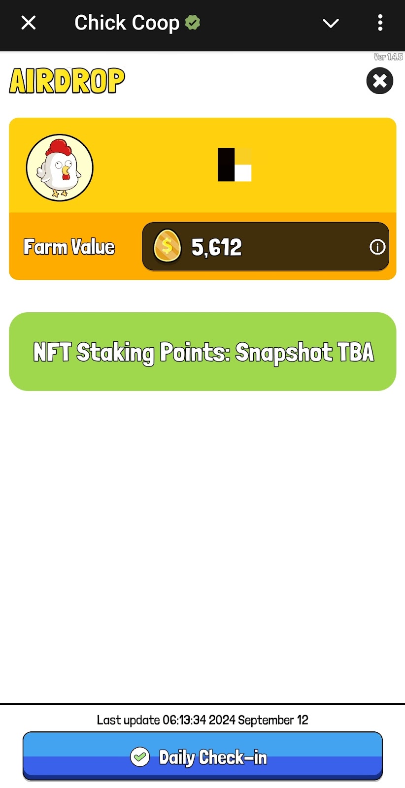 Раздел аирдроп в Chick Coop обозначает ценность фермы в виде золотых монет. Важно: для участия в TGE необходимо иметь на руках NFT проекта.