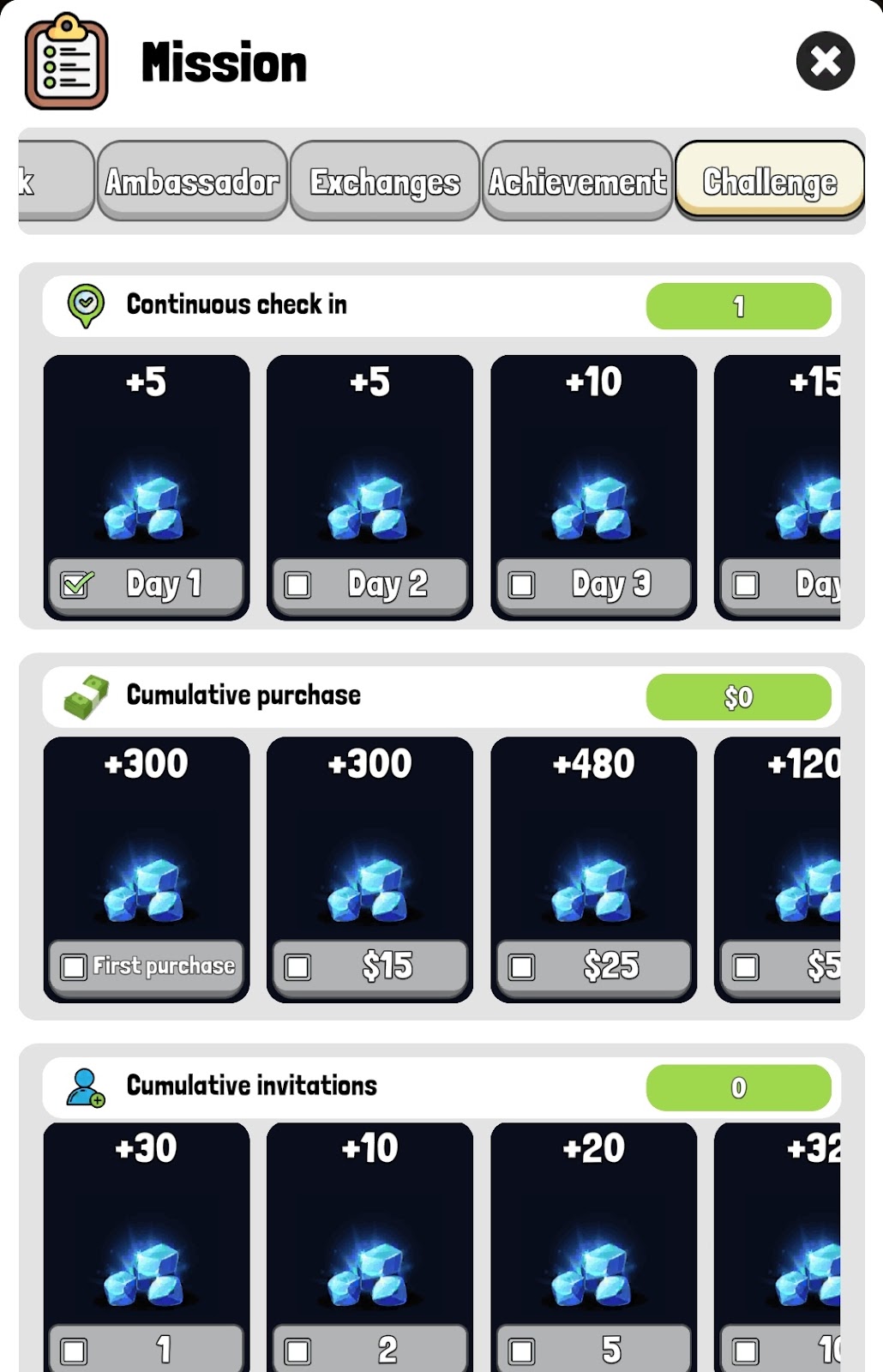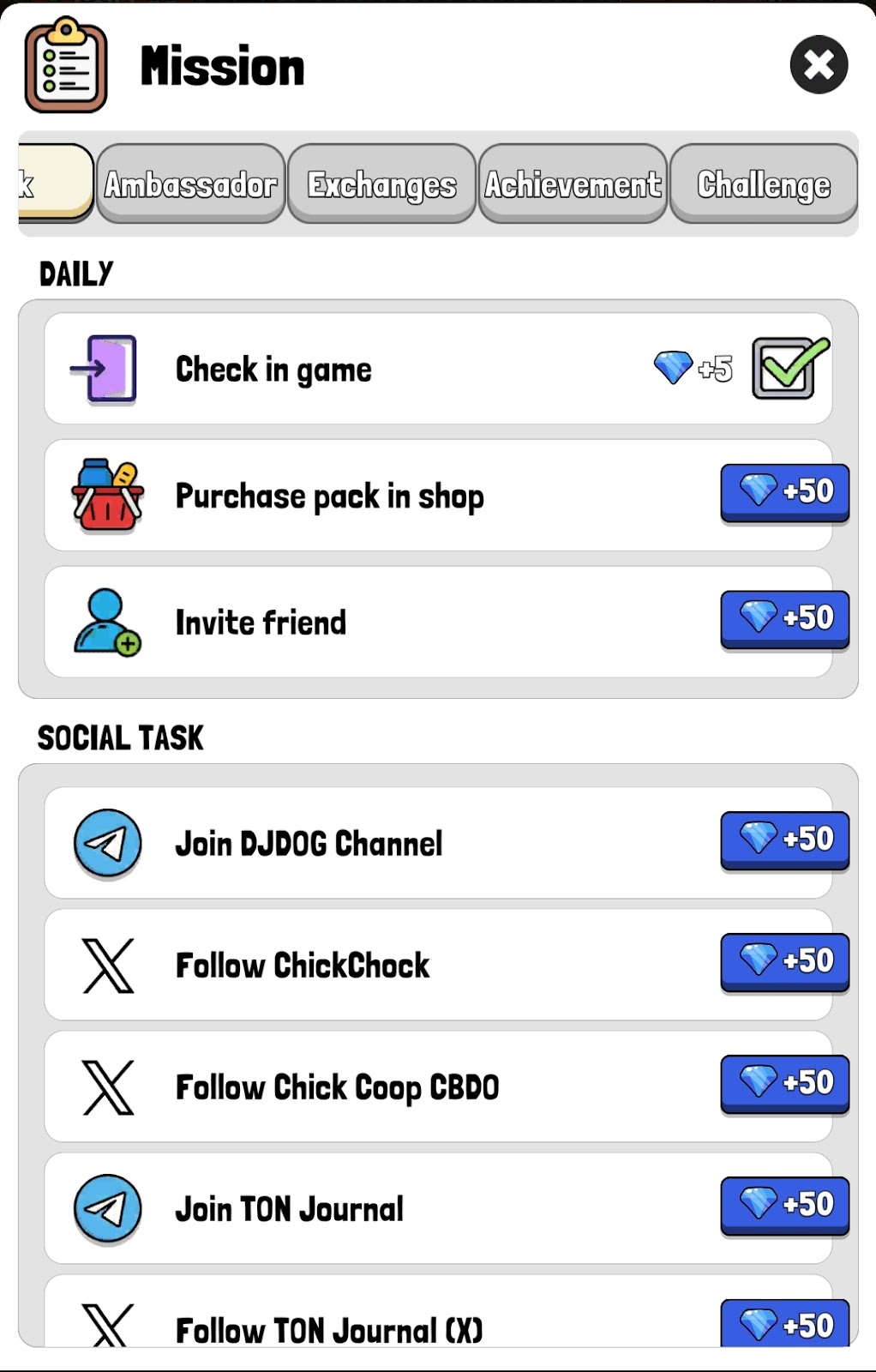 Челленджи в кликере Chick Coop дают большое количество гемов за пополнение и приведенных друзей. Бесплатно можно получать награду только за ежедневный вход.