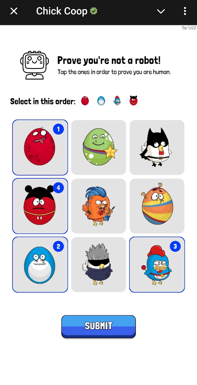 Каких-то секретов в Chick Coop нет, но от многообразия окон у пользователя может возникнуть ощущение, что игра сложная. Это не так. При регистрации в боте пользователь должен пройти антибота — проверку, что играть будет живой человек. Нужно повторить предложенную последовательность, выбрав по порядку ка