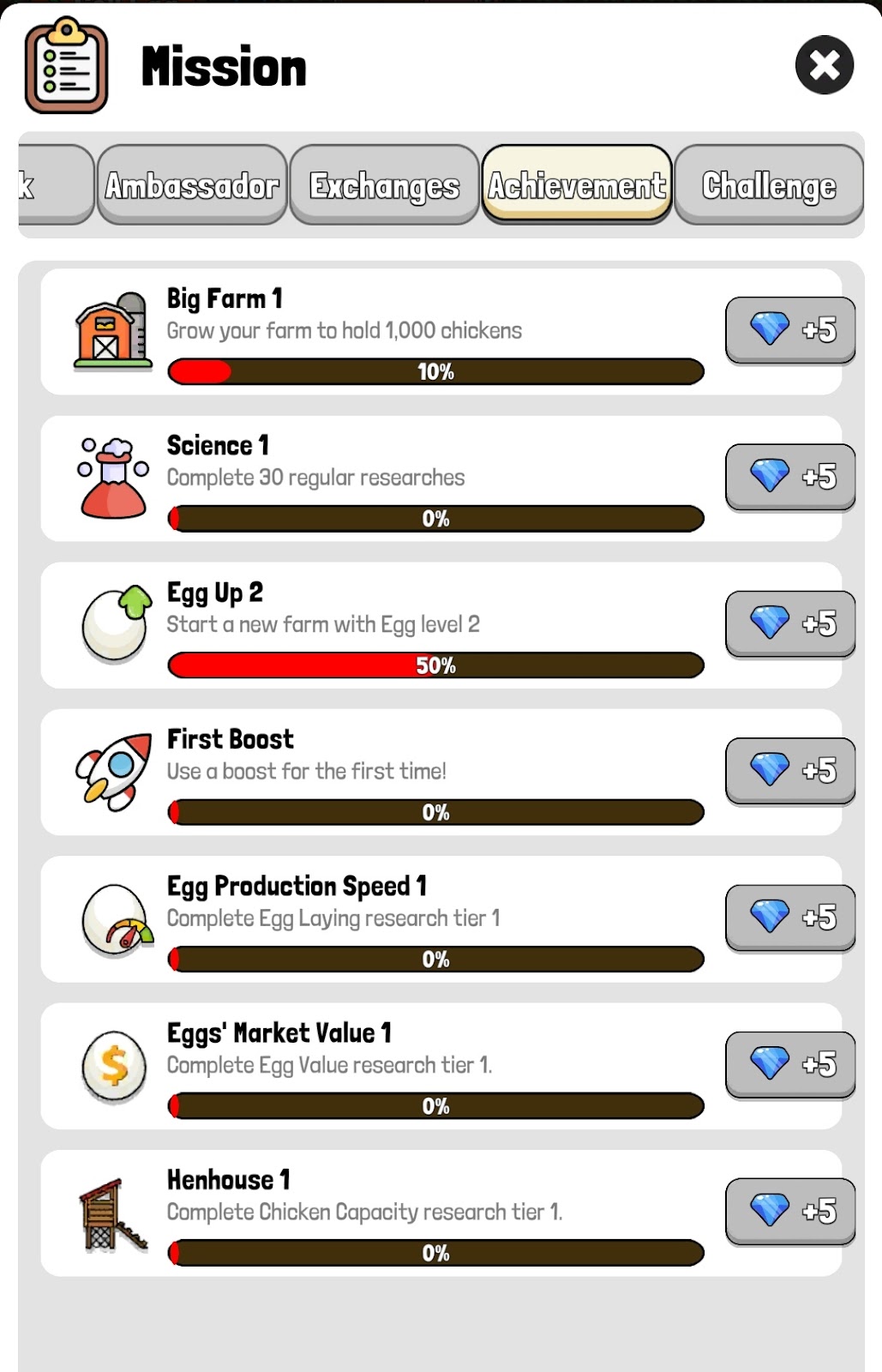 Достижения — вкладка, где игрок получает гемы за то или иное достижение в игре, например, вылупление 1000 куриц.