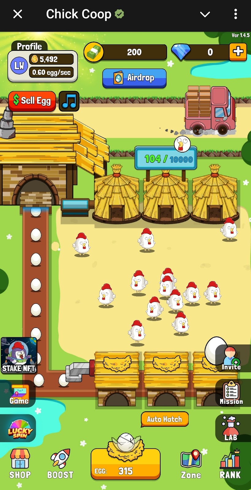 На главном экране Chick Coop telegram показано поле с курами, баланс в игровой валюте, ценность фермы, а также все кнопки магазинов, улучшений и прочего функционала. Здесь нужно кликать по яйцу внизу экрана, чтобы вылуплялись куры. Чем больше птиц на поле, тем выше доход в секунду. Полученные яйца нужно продавать, за них дают игровую валюту для прокачки аккаунта.