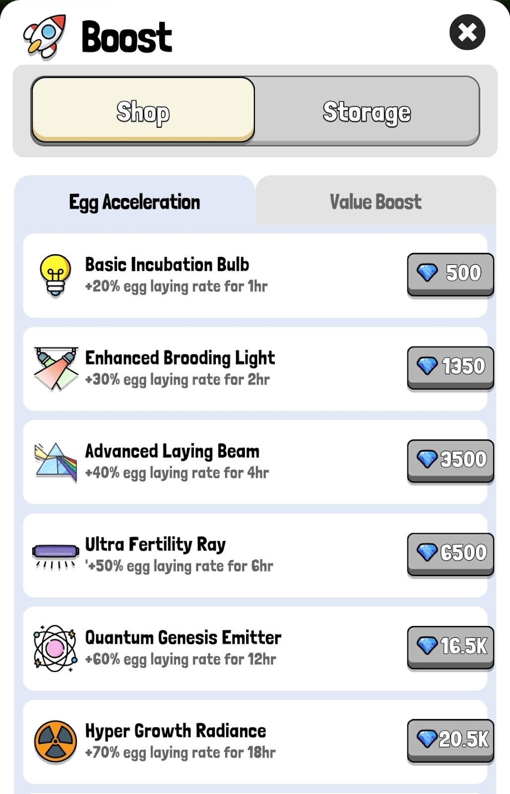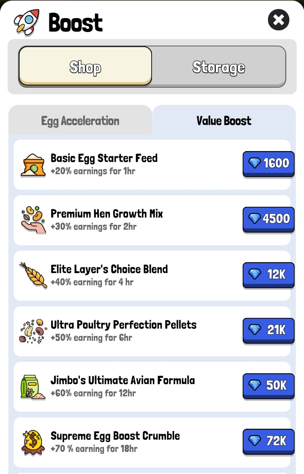 Также можно увеличивать ценность фермы во вкладке Value Boost. Раздел Storage открывается только после первого пополнения баланса.
