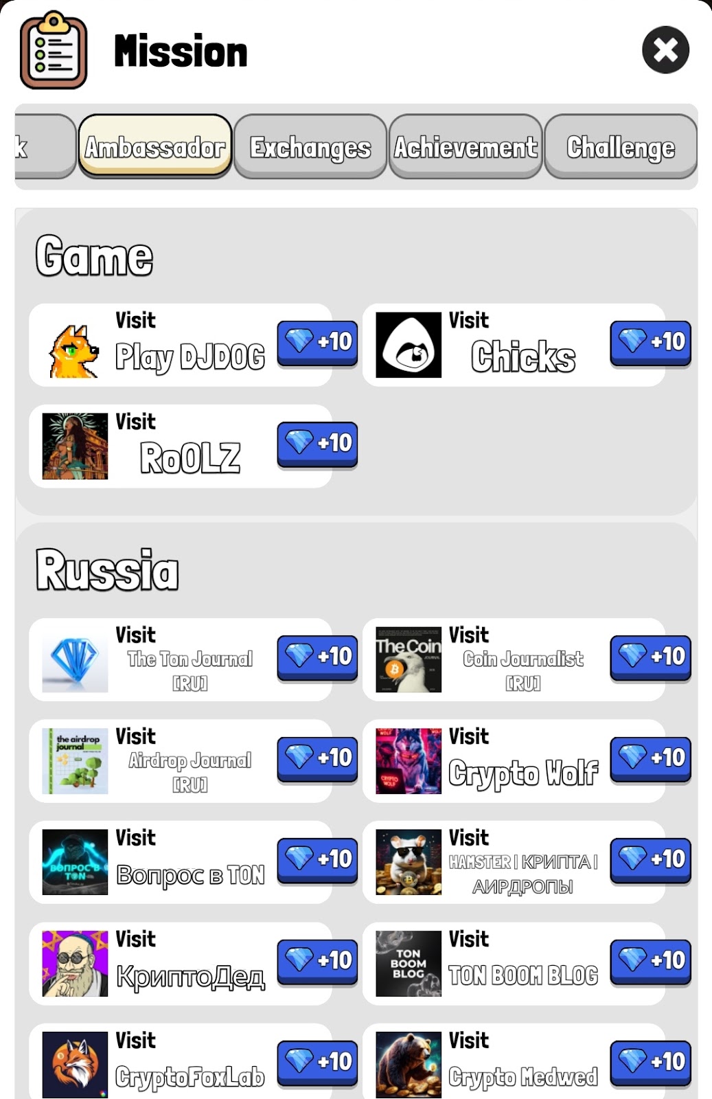 Во вкладке Амбассадор каналы и игры, которые попали в тапалку в качестве оплаченной рекламы. Стоимость этих заданий всего 10 гем.
