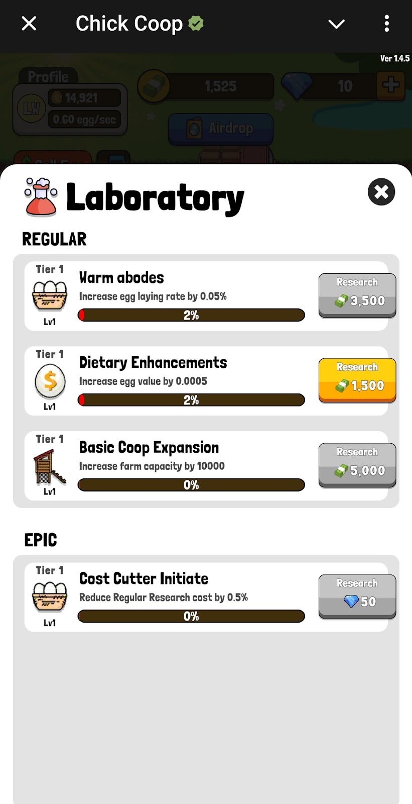В лаборатории пользователь прокачивает свою ферму за те деньги, которые выручает от продажи яиц. Кажется, что суммы прокачки слишком большие, но это не так. Поинты копятся очень быстро, к тому же в игре есть довольно приятный бонус.