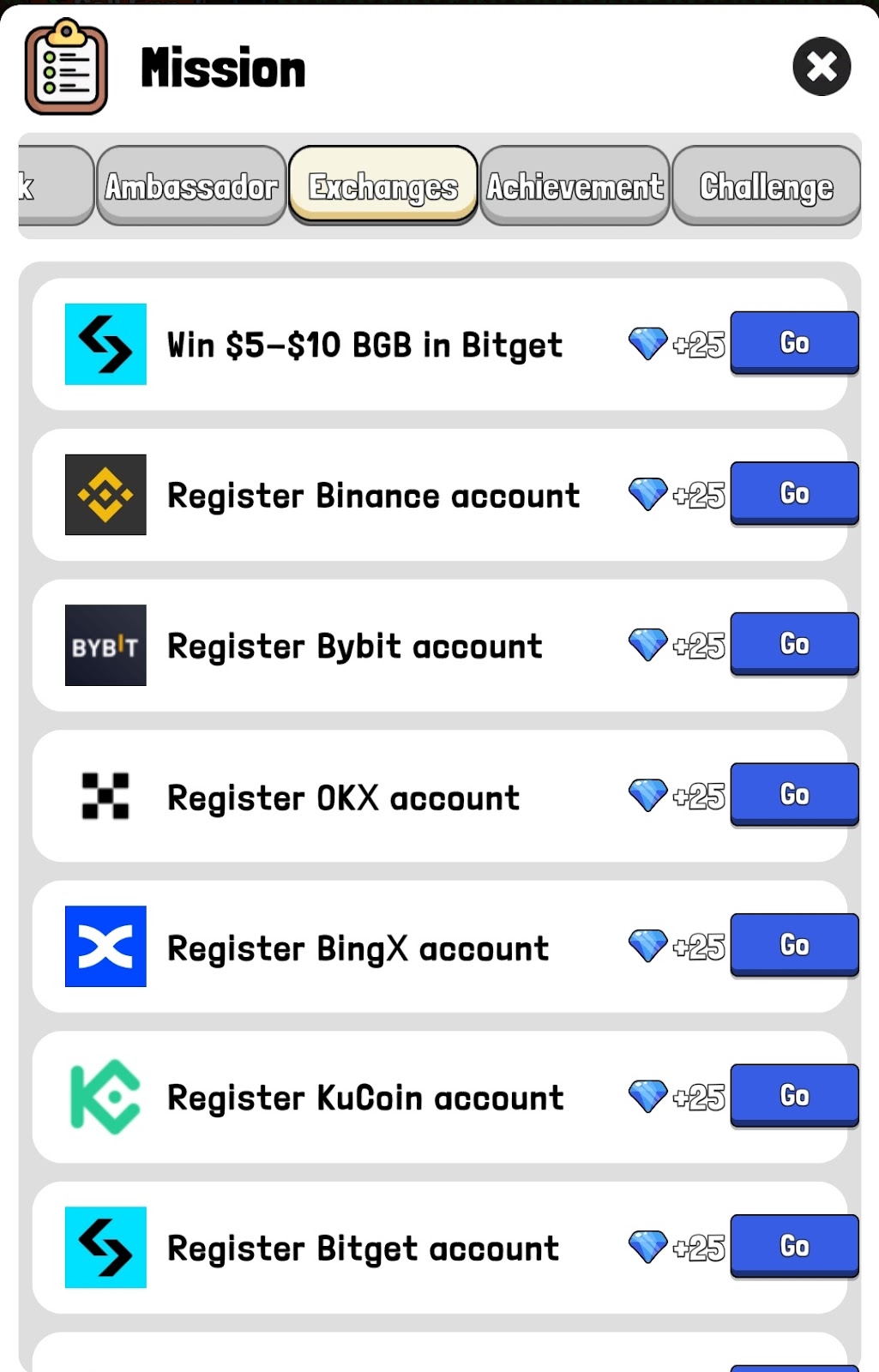 Задания про обменники и биржи в Телеграмм Chick Coop предполагает регистрацию на платформах по реферальным ссылкам основателей игры. Здесь можно заработать по 25 гемов за каждое задание.