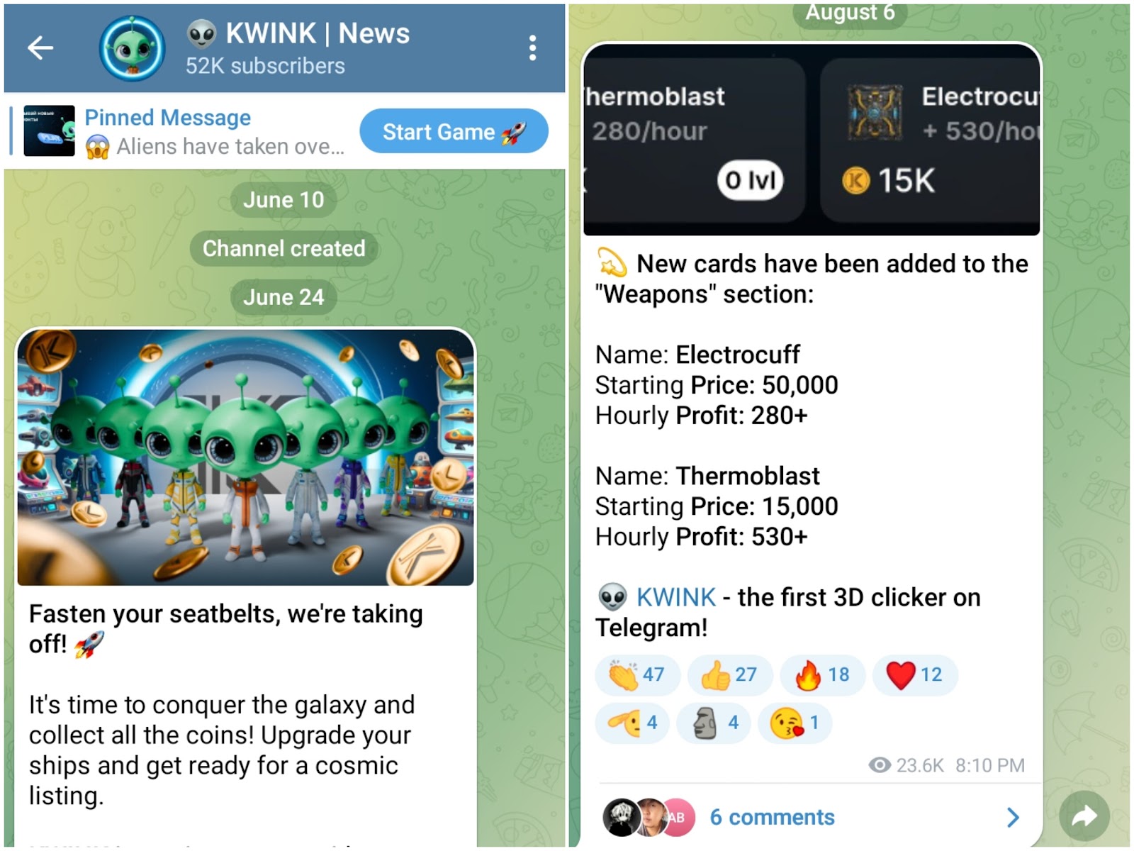 6 августа 2024 года был опубликован пост о том, что в боте добавилась новая карточка с оружием. До этого аудиторию также уведомляли о том, что в Kwink bot происходили изменения.