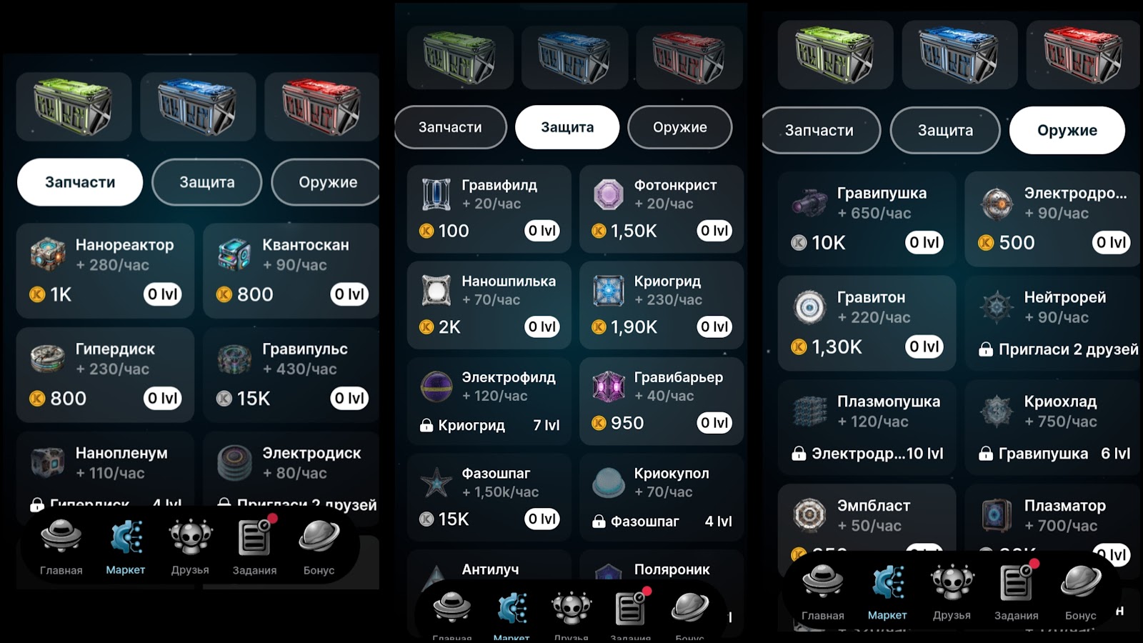 - “Защита”. Гравифилд продается за 100 монет, дает 20 токенов в час. Фотонкрист продается за 1.5k монет и предоставляет 20 монет. Наношпилька стоит 2 тыс. токенов, начисляет 70 токенов. Криогрид — 1.9k монет, начисляет 230 монеток за 1 час