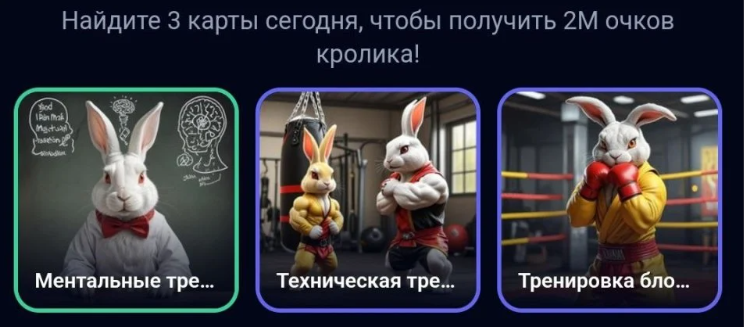 В отдельной вкладке игрок в Rocky Rabbit в ТГ канале может выбрать опцию Шахта. Там нужно выбрать 3 карты, которые дадут игроку 2 млн токенов. Есть вкладка Битвы. Там пользователи могут сражаться против других игроков. Для разблокировки этой секции нужно открыть карту Specter Tournament.