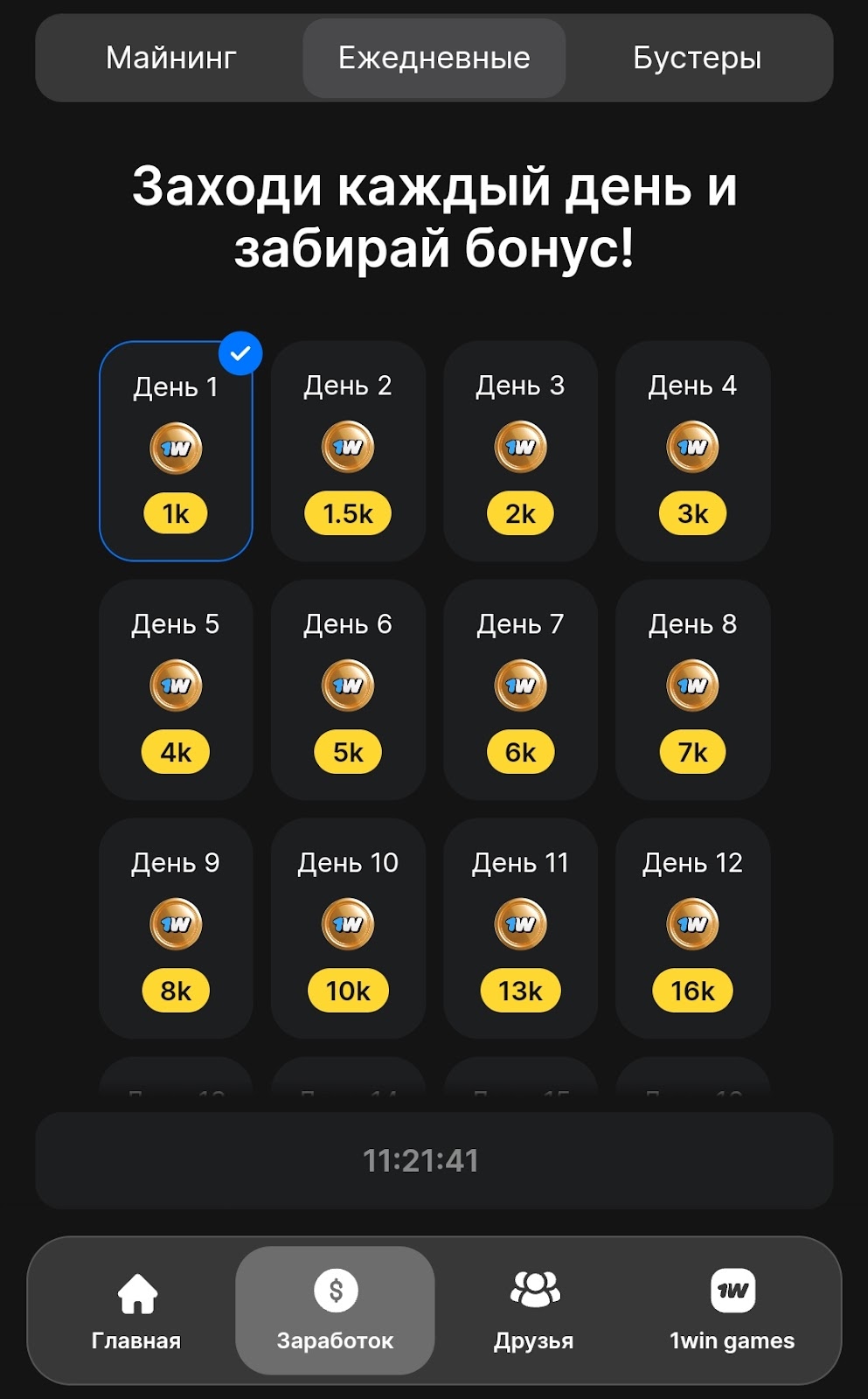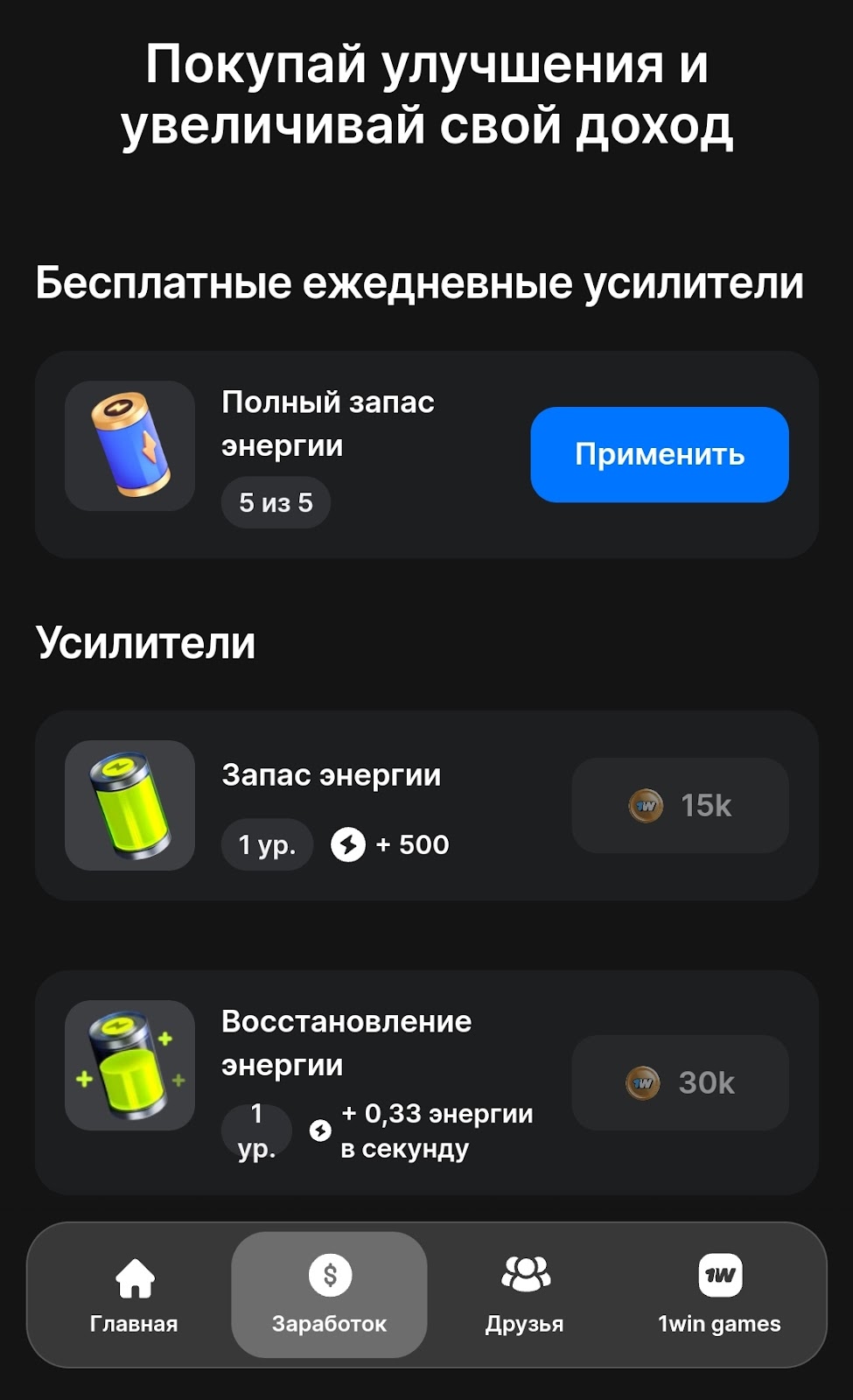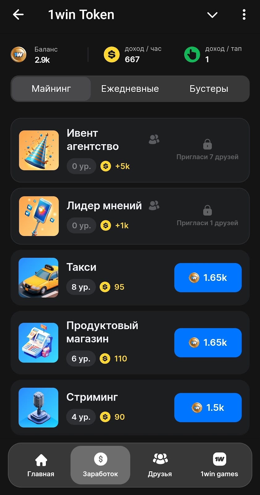 Раздел Заработок — прокачка карточек для пассивного майнинга, некоторые требуют приглашения друзей для открытия. Стратегии в 1win каждый выстраивает, исходя из своих возможностей: частота захода в игру, наличие рефералов и пр. Есть ежедневный бонус и бусты.