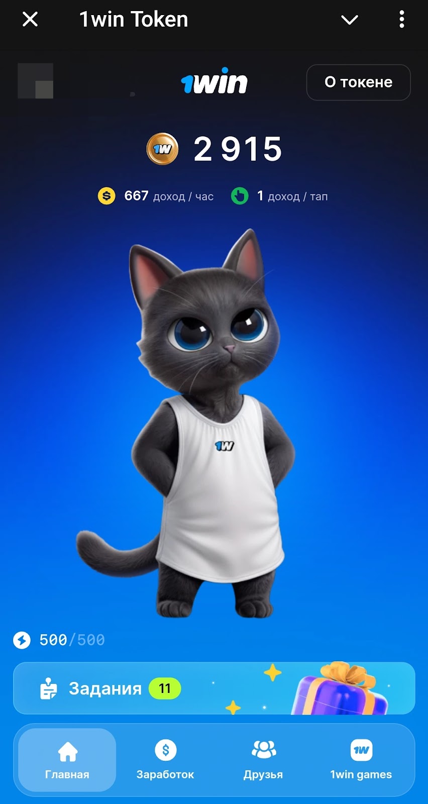 В приложении 1win token bot 4 вкладки. На первой можно кликать по котику, чтобы получать поинты. Здесь же показан пассивный доход в час и количество фишек за один тап. Есть задания с подписками на социальные сети.