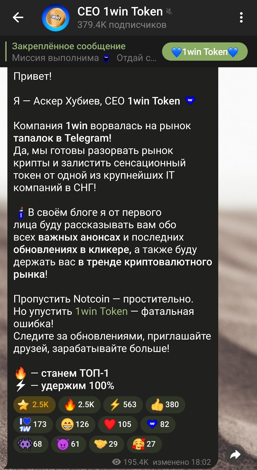 Новостей о 1win token стало появляться больше, БК закупает рекламу тапалки, чтобы расширить аудиторию. Однако до сих пор не стали известны условия 1win airdrop. В Телеграм 1win token выложили информацию, что теперь контентом будет заниматься CEO Аскер Хубиев, канал превратился в его личный блог.
