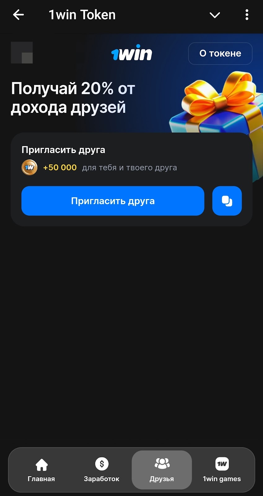 Друзья — вкладка в тапалке 1вин со ссылкой для пассивного дохода с рефералов. За приведенных игроков начислят 50 000 фишек и 20% от их майнинга.