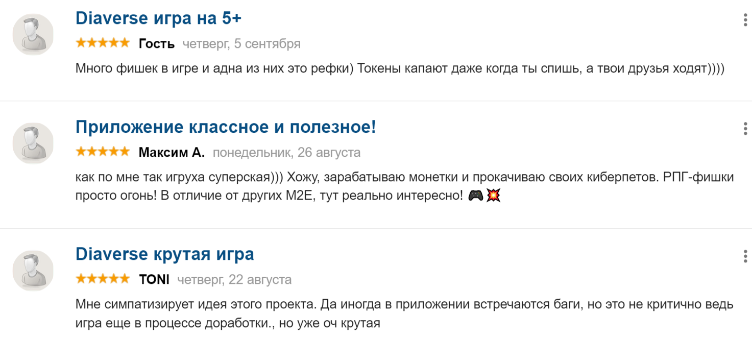 Проект Диаверс сравнительно молодой, поэтому большого количества отзывов пока нет. В интернете периодически попадаются положительные комментарии, в которых игроки отмечают яркий интерфейс, большое количество интересных фишек и оригинальную идею.