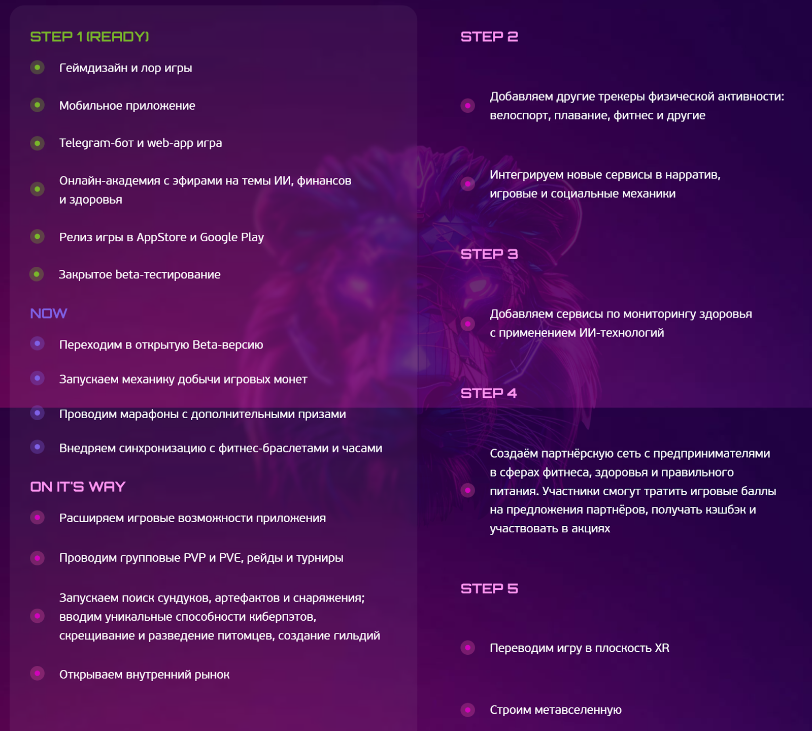 На официальном сайте приводится краткая roadmap с указанием планов, но без конкретных дат по их реализации. Первый шаг по выпуску приложений и запуску бета-тестирования уже реализован. На текущем этапе проводится работа по переходу в открытую Beta-версию, запуску новой механики, внедрению марафонов и синхронизации с фитнес-браслетами.