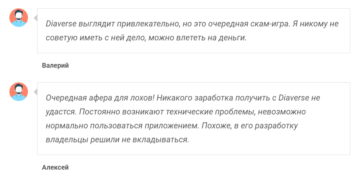 Нельзя отметать и негативные отзывы о СКАМе Диаверс Гейм, в которых клиенты не уверены в светлом будущем платформы.