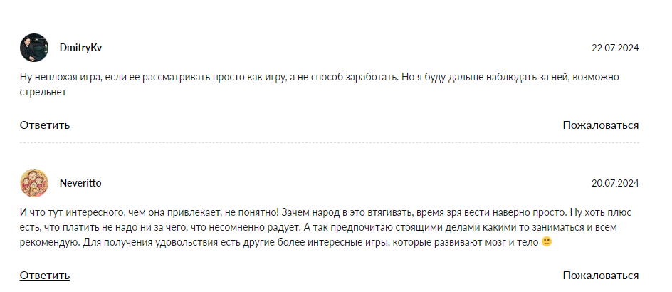 - Мошенники: некоторые люди заявляют о мошенничестве, объясняя это тем, что большинство подобных проектов скам и выкачивание денег. Они предлагают не вкладывать деньги в подобные клик-игры. (не делать фермы и тому подобное)
