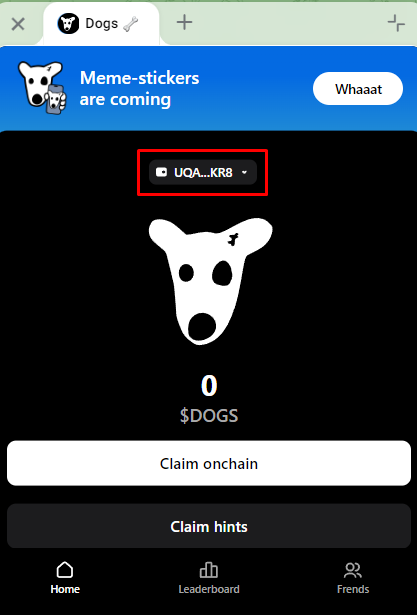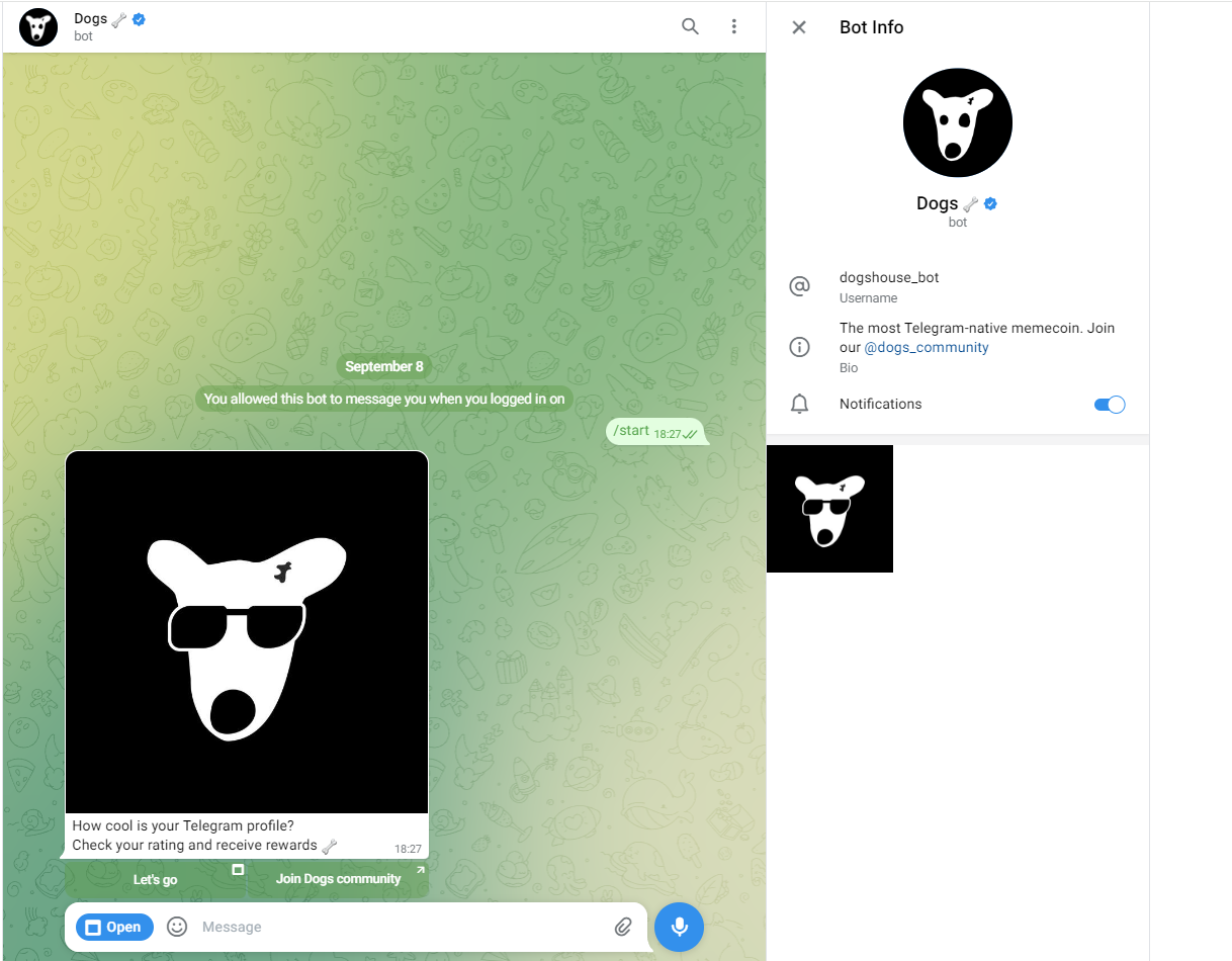 - Переходим в бота => пишем /start и привязываем Telegram кошелек куда выводим полученные мемкоины DOGS
