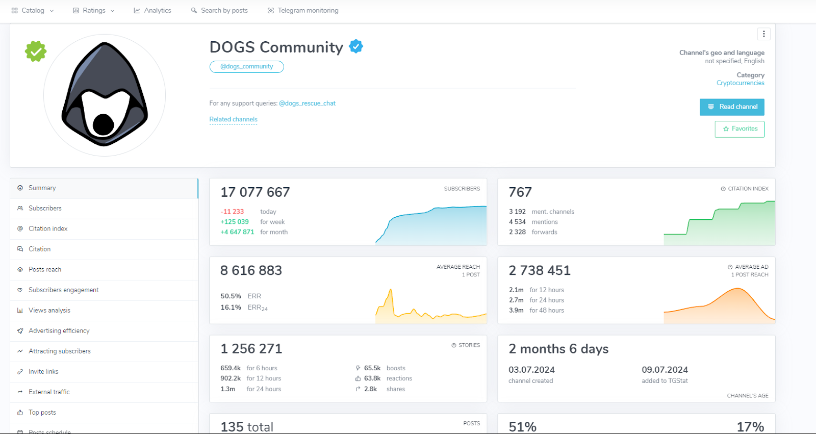 Аудитория, которую собрали создатели dogs community telegram за сутки равна 3 миллионам пользователей, а сейчас на канал подписаны более 17 миллионов человек. Охват публикаций в свою очередь составляет около 45-55% от аудитории.Создатели не имеют своих личных аккаунтов, а точнее не афишируют их и остаются анонимными.