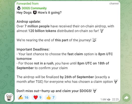 20 августа из 400 млрд токенов каждому активному пользователю дали 9500 $DOGS, представьте какие это объемы, ведь на тот момент количество пользователей составило 42,2 миллиона человек. Отчеты о раздаче токенов ведутся по сей день.