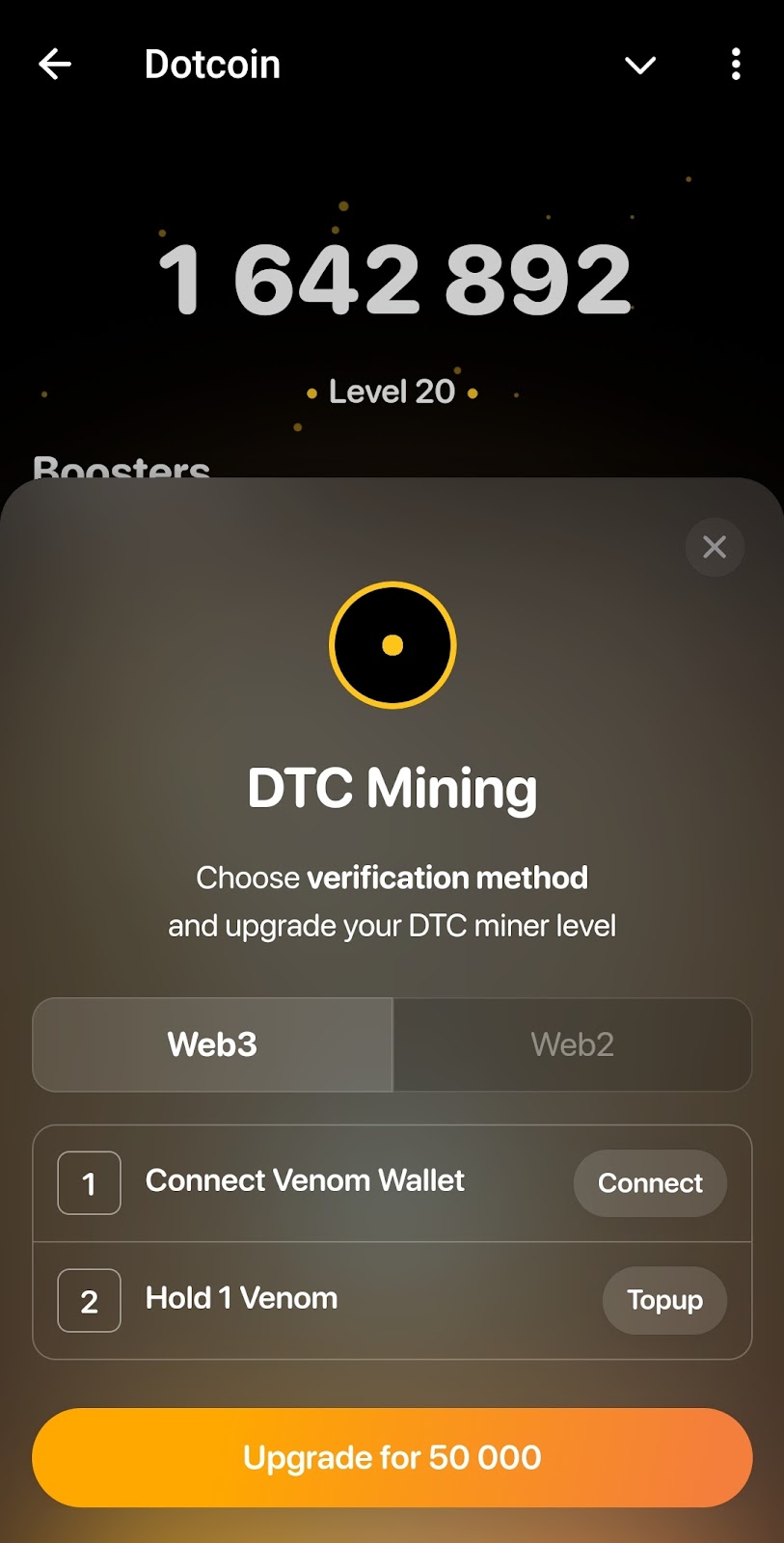 Для майнинга DTC потребуется привязать кошелек Веном и иметь на балансе хотя бы 1 токен. В приложении их можно будет клеймить. Другой вариант начать майнить Dotcoin — пригласить хотя бы одного активного друга и быть подписанным на официальный канал в Телеграмм Dot Coin. Что такое активный друг, в приложении не описано, но он должен набить хотя бы какое-то количество монет, иначе он не будет учтен, и покупка майнера не откроется.