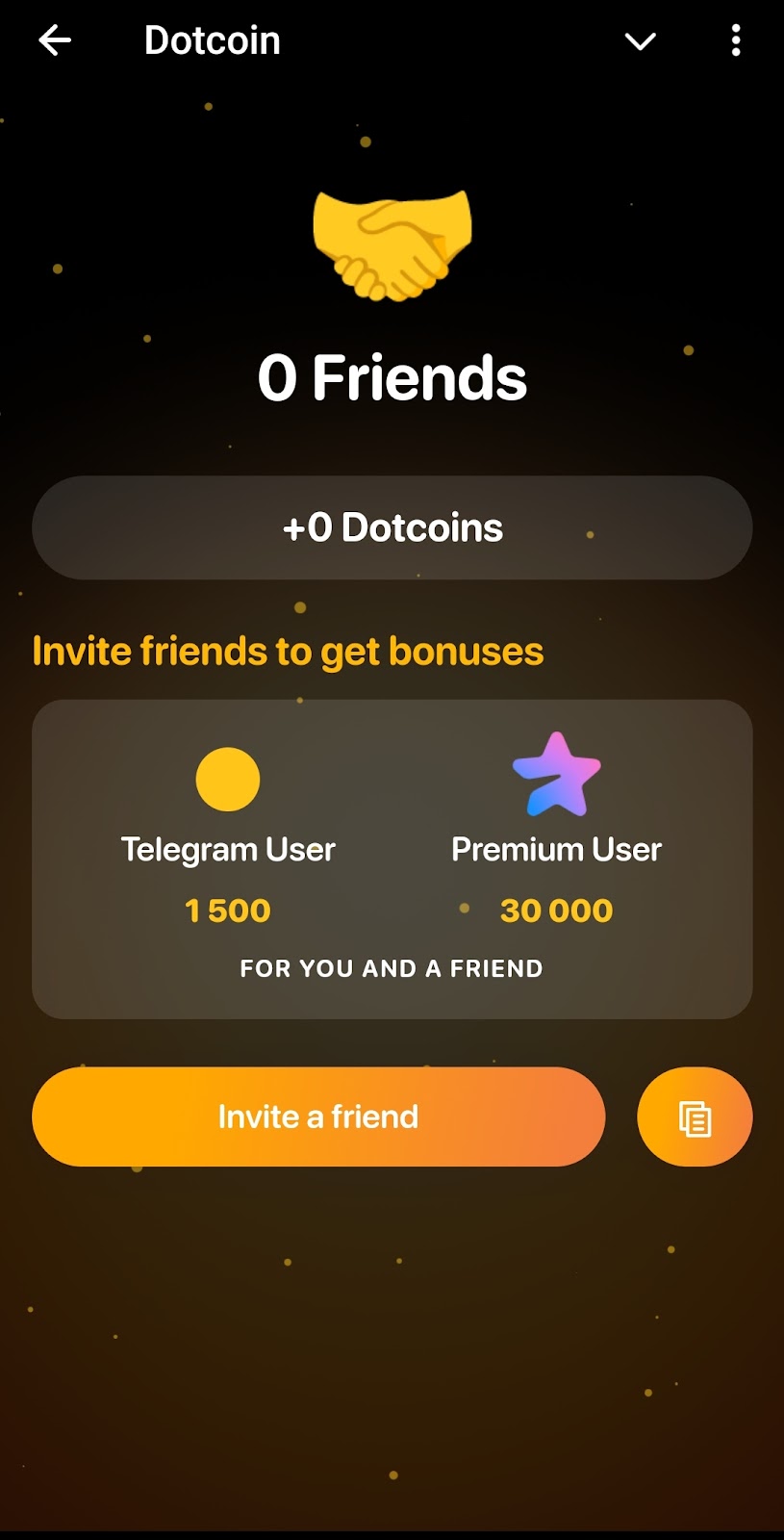 В Телеграм Dotcoin за друзей платят немного, всего 1500 поинтов. Какой процент при этом начисляется от фарма, не указано. Для друзей с Телеграмм Премиум предусмотрен повышенный бонус — 30 000 монет.